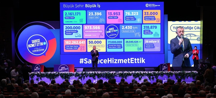 Kocaeli Büyükşehir Belediye Başkanı Tahir Büyükakın, 2024-2026 yılları arasında hayata geçirdiği projeleri kamuoyuyla paylaştı. “Sadece Hizmet Ettik” temalı program, Kocaeli Kongre Merkezi’nde gerçekleştirildi. Başkan Büyükakın kente kazandırılan projeler ve yatırımları “Güvenli ve Konforlu Toplu Taşıma Güçlü Bir Ulaşım Altyapısı, Kentsel Dönüşüm ve Dirençli Şehir, Doğal Kaynaklar ve Güçlü Altyapı, Ortak Yaşam Alanları, Hizmet Kapasitesi, Kültür, Sanat ve Turizm, Gençlik ve Eğitim, Spor Şehri Kocaeli ile Kent Refahı ve Sosyal Kalkınma” başlıkları altında ele aldı.