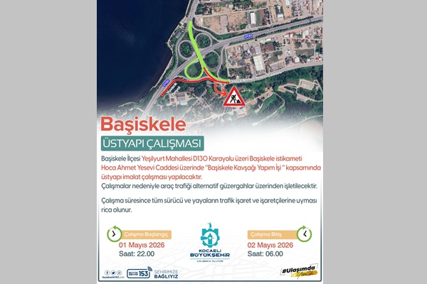 Kocaeli Büyükşehir Belediyesi tarafından Başiskele Yeşilyurt Mahallesi Hoca Ahmet Yesevi Caddesi üzerinde ‘Başiskele Kavşağı Yapım İşi’ kapsamında üstyapı imalatı yapılacak. Gerçekleşecek çalışmalar nedeni ile D-130 Karayolu Başiskele istikameti geçici olarak araç trafiğine kapatılacak ve alternatif güzergahlar kullanılacak. Çalışma süresince sürücülerin ve yayaların trafik işaret ve işaretçilerine dikkatle uymaları hatırlatılırken, olası yoğunluk ve gecikmelerin önüne geçilebilmesi adına alternatif güzergâhların tercih edilmesi tavsiye ediliyor.