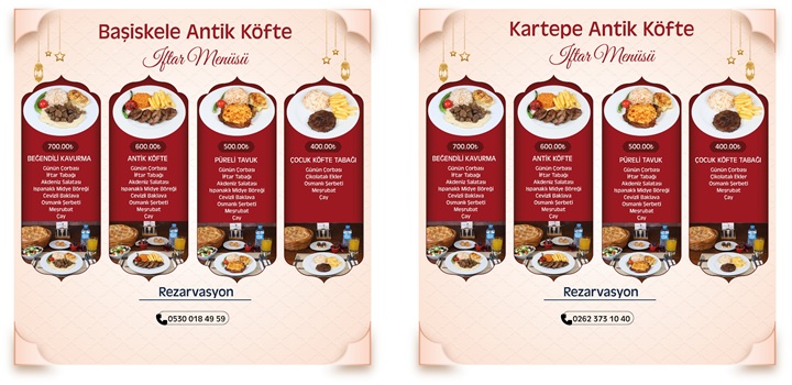 Ramazan boyunca iftar menüleri Kocaeli’nin farklı noktalarındaki Maide Kafe ve Restoran, Mahal Plus, Sekapark Antik Köfte, Darıca Antik Köfte, Darıca İskele Mahal, Balyanoz Antik Köfte, Gebze Millet Bahçesi Antik Köfte Ekspres, Çayırova Millet Bahçesi Mahal, Değirmendere Antik Köfte Ekspres ve franchise olarak hizmetlerini sürdüren Kartepe Antik Köfte ve Başiskele Antik Köfte şubelerinde misafirlere sunulacak.